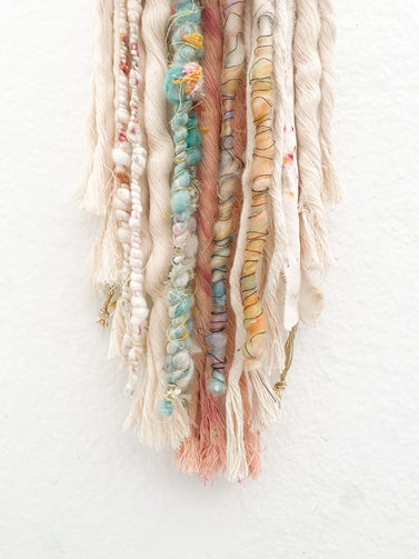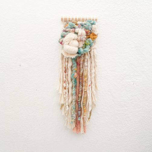 Mini woven wall hanging measuring 5”x18” is packed with the most stunning handspun art yarns by renowned spinners from across the globe including Designs by Amber Fibers, Mud and Fiber, and Maple and Raven. Hand dyed chunky cotton string, gold cord, and botanically dyed cotton ribbon from Hayley Haspel complete the fringe. Colors include turquoise, mustard, magenta and chartreuse and plenty of sparkly highlights. Little weaving, big statement.