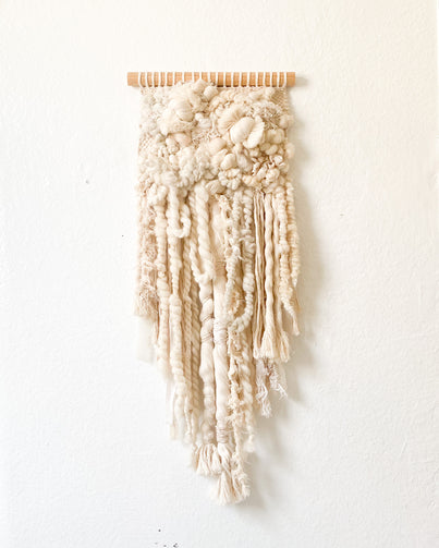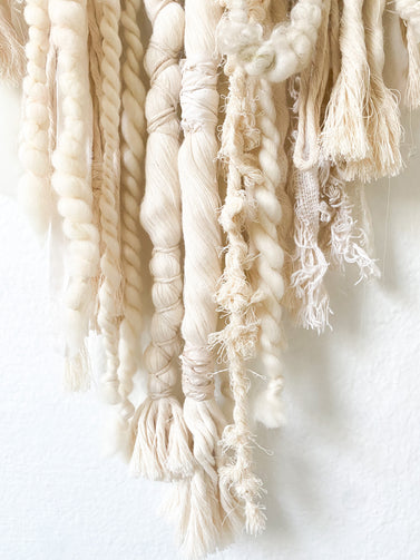 A paradise of neutrals, bursting with texture and featuring moderate gold sparkle throughout. Distressed cotton string, a plethora of handspun art yarns created by talented spinners that span the globe (Australia to Abu Dhabi, the US and Canada - literally a global affair!), extra wide recycled cotton and sari silk ribbons, merino and Leicester wools, upcycled chiffon, hand-wrapped fringe and more commingle to create this creamy wonderland of a piece, measuring 10.5” x 27” and ready to grace your living, loving and working space.