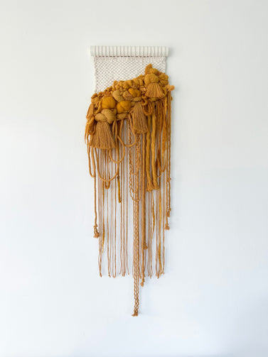 Rich mustards and creamy naturals contrast pleasingly in this statement woven wall hanging. The restrained use of hand dyed wool yarn, merino wool roving, and Turkish cotton string allows one's attention to focus on the multitude of textures within this elegant piece of textile art, which hangs from a hand-painted pine dowel.
