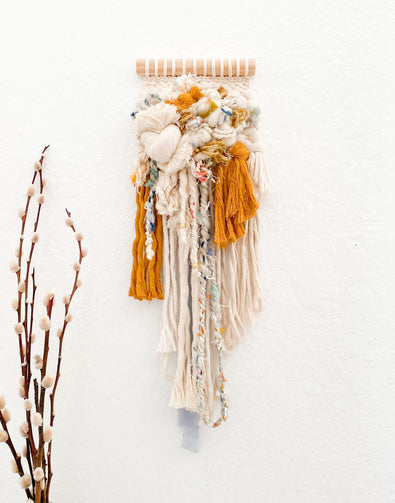 Handwoven mini wall hanging measuring 6”x 19”, featuring imported Turkish cotton string, upcycled chiffon from a dear friend’s wedding, baby alpaca from a local mill; handspun scrap art yarn by Loom Denim (Ashley Thurman) and Got Weaver Fever (Audrey Costruba), golden beads, and more! Mustard, gray and blue tones with teensy pops of coral mingle in a soothing palette.