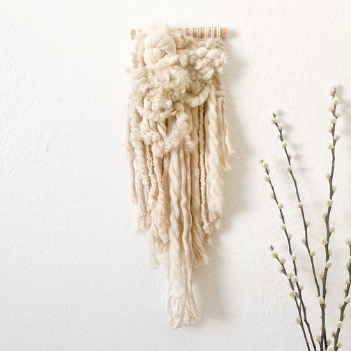 Small woven wall hanging in exclusively natural cream tones and replete with texture, plus a touch of gold sparkle. Imported Turkish cotton string, merino wool, curly locks and handspun art yarn from women artisans worldwide are handwoven and hung from a natural pine dowel.