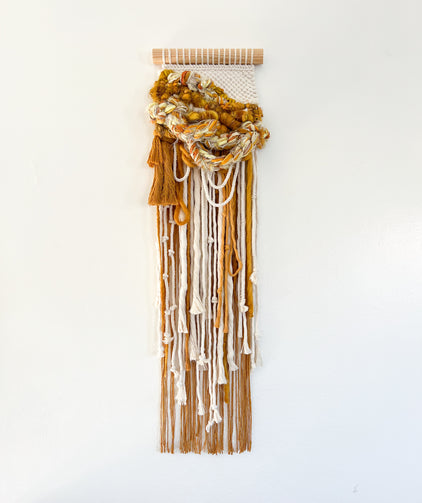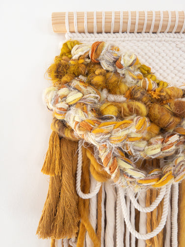 A textural wonderland in cream, mustard and luminous gold, this wall hanging is woven with handspun art yarns, merino roving, hand dyed wool yarn, crocheted assemblage fibers, silk thrums, and Turkish cotton string, hung from a natural pine dowel. Materials are sourced exclusively from other independent, woman-owned businesses worldwide. This weaving is sure to be a conversation starter! Measures 10 by 33 inches.