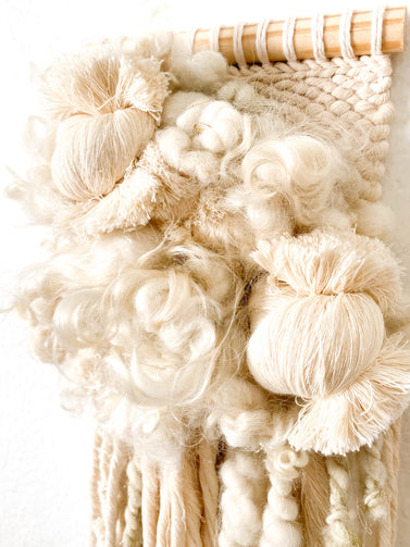 Big statement for a petite piece! The amount of neutral texture in this beauty is insane thanks to the gorgeous handspun Angora and Merino locks and super chunky imported Turkish cotton string. Subtle gold sparkle throughout lends a festive flair. Hand made yarns from five different women artisan spinners, upcycled chiffon and a pine dowel complete this one of a kind, completely handmade frame loom weaving. 7” x 24”.