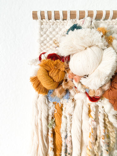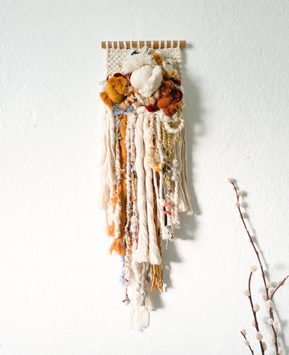 Handwoven wall hanging comprised of imported Turkish cotton string in natural, rust and mustard tones, with pops of sky blue, cranberry and sage. Featuring scrap yarn by renowned spinner Ashley Thurman of Loom Denim, botanically dyed silk scraps from Hayley Haspel, ultra plush velvet, recycled cotton frizz, upcycled chiffon ribbons and much more. Measures six inches wide by about two feet long and hangs from a vintage Greg Rubio dowel.