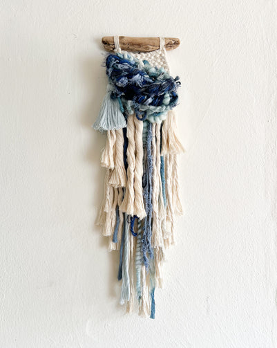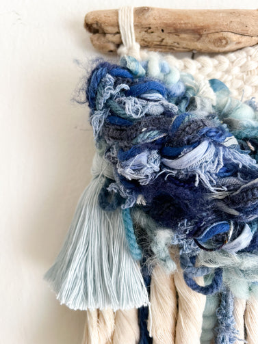 A sweet woven wall hanging comprised of handspun art yarns, recycled cotton frizz, vintage rug yarn, crocheted assemblage fibers, indigo dyed sari silk ribbon, and Turkish cotton string hangs elegantly from a piece of naturally foraged Baja California driftwood. Measures 6 x 20 inches, and features fibers exclusively sourced from other small, independent woman-owned businesses.
