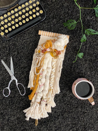 - Handwoven wall hanging featuring signature Rogue Weaving knots, handwrapped imported Turkish cotton fringe, handspun Australian art yarn, botanically dyed cotton, baby alpaca, silk thrums, and much more! A rich palette of mustard and rust against a natural cotton background is complemented by pops of vibrant pink and sage.