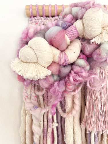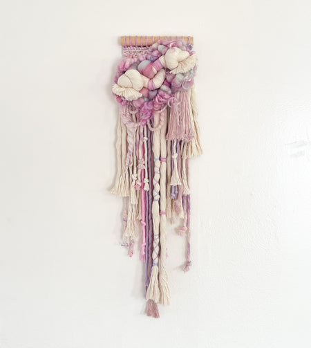Woven in the sweetest, softest palette of lavender, bubblegum, orchid and a touch of baby blue, this piece measures 6” by 25” and features warp string I tie-dyed, a variety of handspun yarns with gorgeous curly locks and texture, the softest merino wool roving and a gently asymmetrical fringe. Hanging from a pine dowel, it would make a lovely addition to a nursery or any other space!