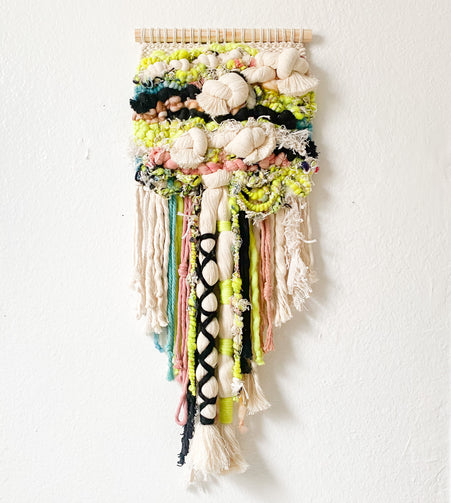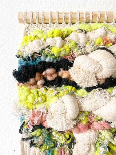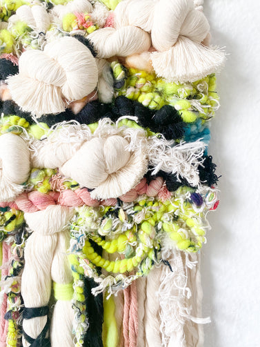 It’s the whimsical color scheme that does it for me! Black and white and neon yellow, with surprising hints of blush and turquoise, this wild piece was inspired by the handspun art yarns of renowned spinner Ashley Thurman of Loom Denim fame. Imported Turkish cotton string, hand dyed merino wool, and recycled cotton frizz mingle to create a pleasing variety of textures in this VERY vibrant statement piece, measuring 11” x 26”.
